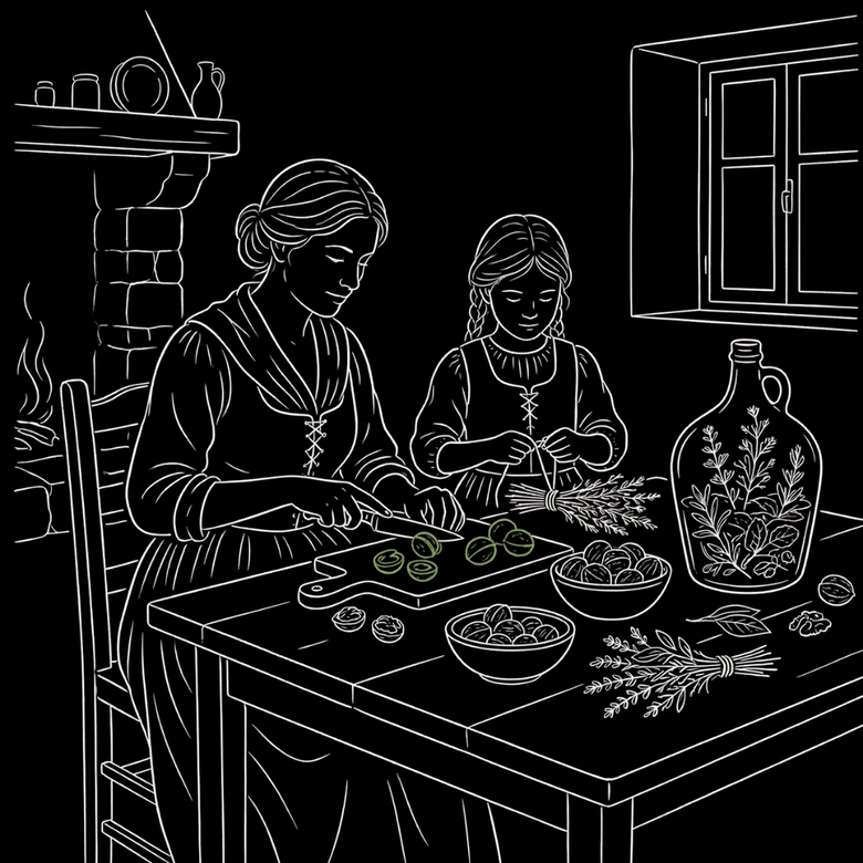 A finals del segle XIX, en un petit poble del Prepirineu, la família Rius tenia una masia envoltada de nogueres i herba lluïsa. L'àvia Teresa Feliu feia ratafia cada estiu seguint un mètode senzill: nous verds per Sant Joan, herbes del seu propi hort i aiguardent comprat al destil·lador local. No era un ritual místic, era un costum de casa.